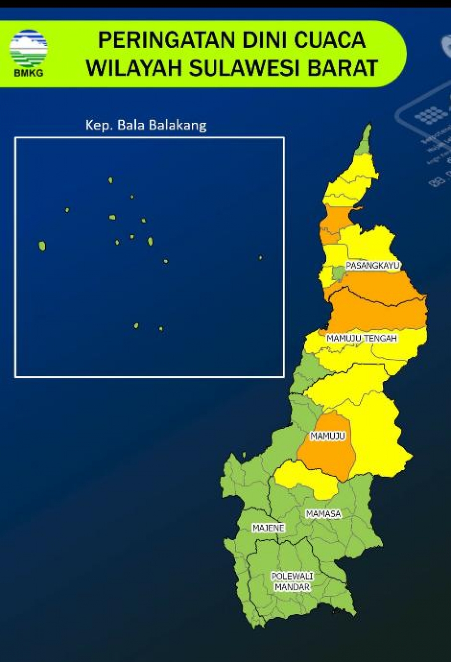 Mamuju – Badan Penanggulangan Bencana Daerah (BPBD) Provinsi Sulawesi Barat (Sulbar) melalui Pusat Pengendalian Operasi Penanggulangan Bencana (Pusdalops) menerima update Peringatan Dini Cuaca dari BMKG Kelas II Tampa Padang, Mamuju, Sulbar, pada Selasa (22/10/2025) pukul 17.21 WITA. Dalam informasi tersebut, BMKG menyebutkan masih berpotensi terjadi hujan dengan intensitas sedang hingga lebat yang dapat disertai kilat/petir dan angin kencang pada pukul 17.35 WITA di beberapa wilayah, antara lain: Kabupaten Pasangkayu: Bambalamotu, Pasangkayu, Pedongga Kabupaten Mamasa: Pana Kabupaten Mamuju Tengah: Karossa dan sekitarnya. Potensi hujan juga dapat meluas ke wilayah: Kabupaten Pasangkayu: Dapurang, Tikke Raya, Bambaira Kabupaten Mamuju: Sampaga, Tommo Kabupaten Mamasa: Sesenapadang, Nosu Kabupaten Mamuju Tengah: Tobadak, Pangale, Budong-Budong, Topoyo dan sekitarnya. Kondisi ini diperkirakan masih dapat berlangsung hingga pukul 19.30 WITA. Plt. Kalaksa BPBD Sulbar, Muhammad Yasir Fattah, mengimbau masyarakat agar tetap waspada terhadap potensi bencana hidrometeorologi, seperti banjir, tanah longsor, dan angin kencang yang dapat terjadi akibat cuaca ekstrem. “BPBD Sulbar terus melakukan pemantauan dan koordinasi dengan BPBD kabupaten, serta memastikan tim TRC tetap siaga di lapangan. Kami mengimbau masyarakat agar segera melapor ke pemerintah desa atau BPBD terdekat jika terjadi kondisi darurat,” ujar Yasir Fattah. Arahan dan petunjuk Gubernur Sulbar Suhardi Duka, agar seluruh jajaran perangkat daerah terkait meningkatkan kesiapsiagaan dan respons cepat terhadap potensi bencana akibat kondisi cuaca yang dinamis. BPBD Sulbar melalui Pusdalops terus memantau perkembangan kondisi cuaca terkini dan memperkuat sistem informasi kebencanaan guna memastikan keselamatan masyarakat di seluruh wilayah Sulbar. Naskah : BPBD Sulbar Editor : Tim Humas Pemprov Sulbar