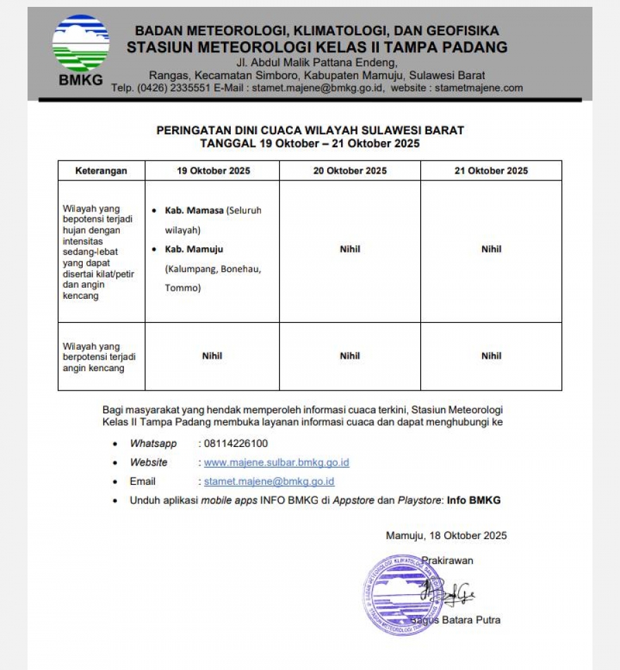 Mamuju, 19 Oktober 2025 - Badan Penanggulangan Bencana Daerah (BPBD) Provinsi Sulawesi Barat menerima informasi dari BMKG Kelas II Tampapadang Sulawesi Barat mengenai peringatan dini cuaca untuk wilayah Sulawesi Barat periode 19 hingga 21 Oktober 2025. Berdasarkan informasi BMKG, pada tanggal 19 Oktober 2025 terdapat potensi hujan dengan intensitas sedang hingga lebat yang dapat disertai kilat, petir, dan angin kencang di: Kabupaten Mamasa (seluruh wilayah) Kabupaten Mamuju meliputi wilayah Kalumpang, Bonehau, dan Tommo Sementara itu, untuk tanggal 20 hingga 21 Oktober 2025, BMKG melaporkan tidak terpantau potensi cuaca signifikan (nihil) di wilayah Sulawesi Barat. Menanggapi hal tersebut, Plt. Kalaksa BPBD Sulbar, Muhammad Yasir Fattah, mengimbau masyarakat agar tetap waspada terhadap potensi bencana hidrometeorologi seperti banjir, tanah longsor, dan pohon tumbang, terutama di daerah rawan dan dengan topografi curam. “Kami telah menindaklanjuti informasi BMKG dengan meneruskan peringatan dini ini kepada BPBD kabupaten dan para relawan di wilayah terdampak. Masyarakat diimbau untuk selalu memperbarui informasi cuaca serta segera melapor jika terjadi kondisi darurat,” ujar Yasir Fattah. Ia menambahkan bahwa langkah-langkah kesiapsiagaan terus diperkuat sesuai dengan petunjuk Gubernur Sulawesi Barat, Suhardi Duka, agar seluruh jajaran BPBD senantiasa aktif dalam mitigasi dan penanganan potensi bencana di musim hujan. (Rls)