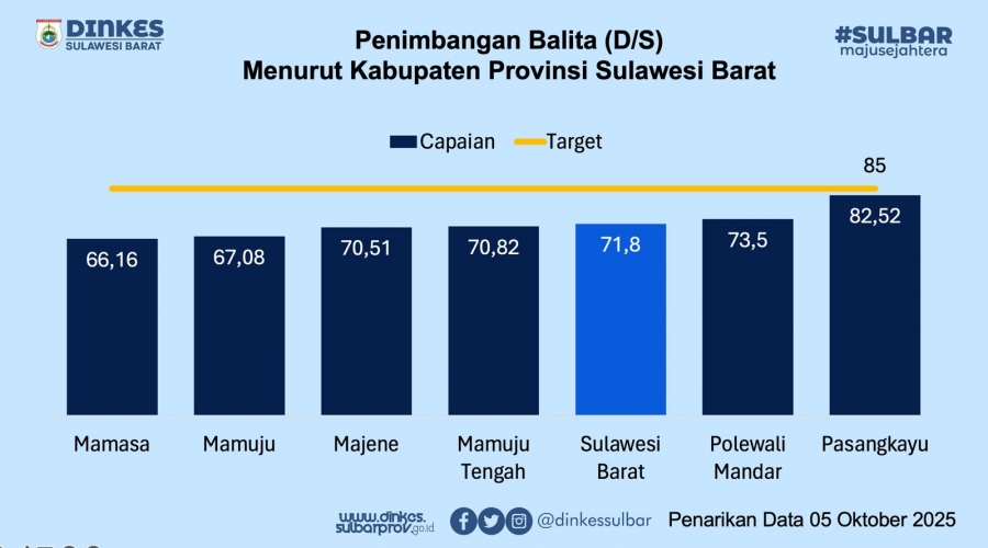 Mamuju - Upaya peningkatan penimbangan balita di Sulawesi Barat menunjukkan hasil positif. Berdasarkan data per 5 Oktober 2025, capaian penimbangan balita (D/S) Provinsi Sulawesi Barat telah mencapai 71,8 Persen, dengan Kabupaten Pasangkayu mencatatkan capaian tertinggi 82,52 Persen dan Mamasa masih perlu penguatan dengan capaian 66,16 Persen. Peningkatan ini menjadi wujud nyata dari upaya pemerintah daerah dalam membangun generasi sehat dan berdaya saing melalui Gerakan Cinta Posyandu, yang merupakan bagian penting dari pelaksanaan Misi ke-3 Pemerintah Provinsi Sulawesi Barat “Membangun Sumber Daya Manusia yang Unggul dan Berkarakter”, sebagaimana digagas oleh Gubernur Suhardi Duka dan Wakil Gubernur Salim S. Mengga. Plt. Kepala Dinas Kesehatan Provinsi Sulawesi Barat, dr. Nursyamsi Rahim, menyampaikan bahwa capaian ini menunjukkan semangat kolaboratif dari para kader Posyandu, tenaga kesehatan, dan masyarakat dalam memastikan setiap anak mendapatkan pemantauan tumbuh kembang secara rutin. "Posyandu bukan hanya tempat timbang anak, tetapi ruang tumbuh harapan dan edukasi bagi keluarga. Melalui Gerakan Cinta Posyandu, kita ingin menghidupkan kembali semangat kebersamaan untuk mewujudkan generasi Sulbar yang sehat, cerdas, dan berkarakter,” kata dr. Nursyamsi, Sabtu 18 Oktober 2025. Gerakan Cinta Posyandu dirancang untuk memperkuat peran Posyandu sebagai pusat layanan terpadu keluarga tidak hanya fokus pada kesehatan ibu dan anak, tetapi juga menyentuh aspek gizi, pola asuh, hingga pemberdayaan ekonomi masyarakat desa. Kegiatan penimbangan balita ini juga menjadi bagian dari implementasi program PASTI PADU (Pencegahan dan Penanganan Stunting dan Kemiskinan Ekstrem Terpadu) yang digalakkan oleh Pemerintah Provinsi Sulawesi Barat, yang mendukung pencapaian Visi Sulawesi Barat Maju dan Sejahtera. Melalui kolaborasi lintas sektor, Pemerintah Provinsi Sulawesi Barat berkomitmen memperkuat layanan kesehatan dasar, meningkatkan kesadaran gizi keluarga, dan memastikan setiap balita tumbuh sehat serta berdaya saing. "Langkah kecil seperti menimbang anak di Posyandu adalah upaya besar untuk masa depan. Karena dari Posyandu, lahir generasi kuat menuju Sulawesi Barat Maju dan Sejahtera,” ujar dr. Nursyamsi. Naskah : Dinkes Sulbar…