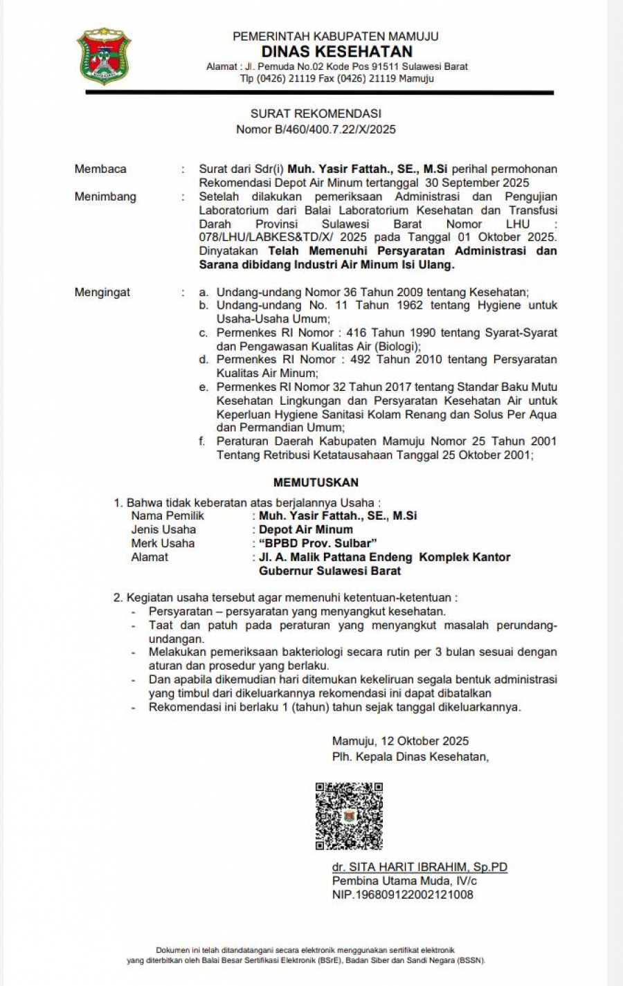 Mamuju — Badan Penanggulangan Bencana Daerah (BPBD) Provinsi Sulawesi Barat (Sulbar) telah menerima surat rekomendasi kelayakan kendaraan Water Treatment dengan Nomor: B/460/400.7.22/X/2025 tanggal 12 Oktober 2025. Dengan terbitnya surat rekomendasi tersebut, kendaraan Water Treatment BPBD Sulbar dinyatakan telah memenuhi seluruh persyaratan administrasi dan layak digunakan dalam pelayanan kepada masyarakat. Kendaraan Water Treatment ini merupakan salah satu aset penting dalam mendukung penanganan darurat bencana, khususnya dalam penyediaan air bersih bagi masyarakat terdampak bencana di wilayah Sulbar. Plt. Kepala Pelaksana BPBD Sulbar, Muhammad Yasir Fattah, menyampaikan apresiasi atas dukungan semua pihak yang telah membantu proses administrasi hingga terbitnya rekomendasi ini. “Dengan terbitnya surat rekomendasi ini, kendaraan Water Treatment BPBD Sulbar resmi dapat beroperasi dan siap digunakan untuk kebutuhan pelayanan kemanusiaan di lapangan. Ini adalah bentuk komitmen kami untuk terus meningkatkan kesiapsiagaan dan pelayanan kepada masyarakat,” ujar Yasir Fattah, Rabu 15 Oktober 2025. Yasir Fattah menegaskan, langkah ini sejalan dengan instruksi Gubernur Sulbar Suhardi Duka, yang menekankan pentingnya kesiapan sarana dan prasarana penanggulangan bencana di daerah. “Gubernur mengarahkan agar seluruh peralatan dan kendaraan operasional BPBD selalu dalam kondisi siap pakai, termasuk Water Treatment, yang berperan vital dalam situasi darurat,” tambahnya. Dengan kelayakan administrasi yang telah dipenuhi, BPBD Sulbar siap mengoperasikan kendaraan Water Treatment ini dalam berbagai situasi tanggap darurat, terutama dalam mendukung kebutuhan air bersih di lokasi bencana dan daerah rawan kekeringan. Naskah : BPBD Sulbar Editor : Tim Humas Pemprov Sulbar