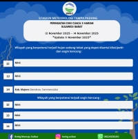 Mamuju — Pusat Pengendalian Operasi Penanggulangan Bencana (Pusdalops) BPBD Provinsi Sulawesi Barat, pada Selasa 11 November 2025, menerima informasi Prakiraan Cuaca wilayah Sulawesi Barat untuk tanggal 12 November 2025 dari BMKG Kelas II Tampa Padang Mamuju.