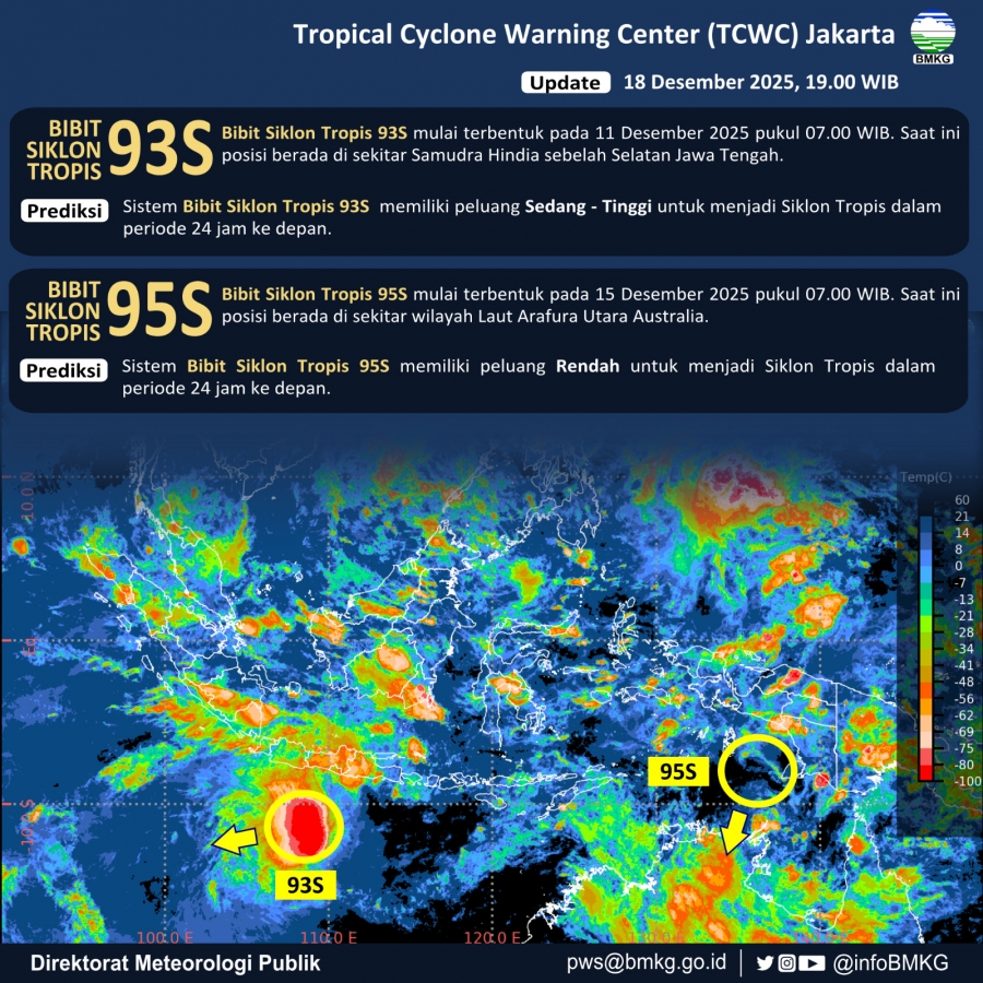 Berdasarkan informasi BMKG, pada Kamis, 18 Desember 2025 pukul 12.40 WIB, Bibit Siklon 93S yang sebelumnya terpantau sejak 11 Desember 2025, kini berkembang menjadi Siklon Tropis dengan kecepatan angin mencapai 65 km/jam, tekanan udara 1001 hPa, dan diperkirakan akan meningkat hingga 100 km/jam pada puncak masa siklonnya.