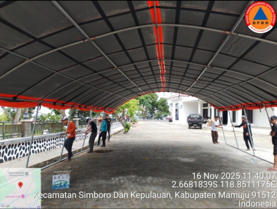 Mamuju— Kepala Bidang Pencegahan dan Kesiapsiagaan, Swandy bersama Tim Reaksi Cepat (TRC) Badan Penanggulangan Bencana Daerah (BPBD) Provinsi Sulawesi Barat (Sulbar) melaksanakan kegiatan pemasangan tenda di Rumah Jabatan Gubernur Sulbar, Minggu 16 November 2025. Pemasangan tenda ini dilakukan sebagai bagian dari dukungan fasilitas menjelang penempatan Gubernur Sulbar Suhardi Duka, di rumah jabatan pada 18 November 2025. Tenda yang dipasang oleh personel TRC BPBD Sulbar berfungsi sebagai ruang pendukung untuk kebutuhan penerimaan tamu. Plt. Kalaksa BPBD Sulbar, Muhammad Yasir Fattah, menyampaikan bahwa langkah ini merupakan bentuk dukungan terhadap kebutuhan Pemerintah Provinsi Sulbar, khususnya dalam penyediaan sarana pendukung yang aman dan layak.…