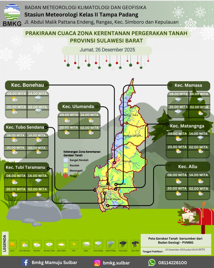 Mamuju — Pusat Pengendalian Operasi Penanggulangan Bencana (Pusdalops) BPBD Provinsi Sulawesi Barat, Kamis 25 Desember 2025, menerima Informasi Prakiraan Cuaca Wilayah Sulawesi Barat hingga tingkat kecamatan dan kelurahan/desa, Prakiraan Cuaca Berbasis Dampak, serta Informasi Daerah Rawan Longsor untuk Jumat, 26 Desember 2025. Informasi tersebut disampaikan oleh BMKG Kelas II Tampa Padang Mamuju, sebagai bagian dari upaya peningkatan kewaspadaan menghadapi potensi cuaca ekstrem dan bencana hidrometeorologi. BMKG menyediakan akses informasi prakiraan cuaca yang dapat dimanfaatkan oleh pemerintah daerah, masyarakat, serta para pemangku kepentingan melalui laman resmi https://cuaca.bmkg.go.id Selain itu, tersedia pula Informasi Prakiraan Cuaca Jalur Darat yang dapat diakses melalui https://signature.bmkg.go.id/dwt/ untuk mendukung keselamatan perjalanan darat di wilayah Sulawesi Barat. Informasi prakiraan cuaca juga dapat diperoleh melalui Aplikasi InfoBMKG yang tersedia di App Store dan Play Store, serta melalui media sosial resmi BMKG di Instagram @bmkg.sulbar, Facebook BMKG Mamuju Sulbar, dan laman resmi Stasiun Meteorologi Kelas II Tampapadang Mamuju di https://stamet-tampapadang.bmkg.go.id Kepala Pelaksana BPBD Sulawesi Barat, Muhammad Yasir Fattah, menyampaikan bahwa informasi dari BMKG tersebut menjadi rujukan penting bagi BPBD Sulawesi Barat dalam melakukan langkah-langkah kesiapsiagaan dan peringatan dini. “Menindaklanjuti arahan Gubernur Sulawesi Barat, Bapak Suhardi Duka, kami mengimbau seluruh BPBD kabupaten dan masyarakat untuk terus memantau perkembangan informasi cuaca dari sumber resmi BMKG, meningkatkan kewaspadaan, serta mengantisipasi potensi bencana hidrometeorologi, khususnya di wilayah rawan longsor dan banjir,” ujarnya. Naskah : BPBD Sulbar Editor : Tim Humas Pemprov Sulbar